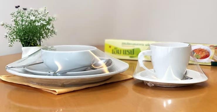 2) ร้านอาหารหรือโรงแรม เป็นเรื่องปกติที่ผู้จัดเตรียมอาหารมักตระเตรียมจาน ชาม ช้อน ส้อม หรือแก้วน้ำไว้สำหรับการรับรองแขก รวมถึงการทำอาหารไว้ล่วงหน้า ซึ่งการวางอาหาร ภาชนะใส่อาหาร และอุปกรณ์รับประทานอาหารไว้บนโต๊ะ อาจไม่ปลอดภัยจากสิ่งสกปรกจำพวกฝุ่นละออง หรือเชื้อโรคเท่าใดนัก ฟิล์มยืดถนอมอาหาร M Wrap คือตัวช่วยอย่างดีในการป้องกันสิ่งสกปรก โดยควรใช้ฟิล์มยืดถนอมอาหาร M Wrap ในการห่อหุ้มอาหาร ภาชนะ และอุปกรณ์สำหรับการรับประทานอาหารเหล่านั้นให้มิดชิด ซึ่งจะช่วยให้เกิดสุขอนามัยที่ดีแก่ผู้บริโภค ปลอดภัยจากเชื้อโรคและฝุ่นละออง