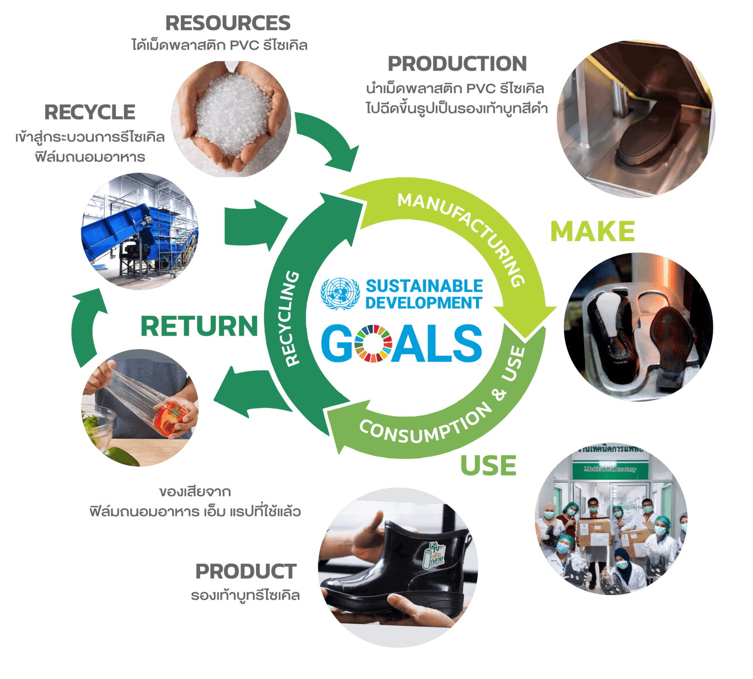 บริษัทฯ ริเริ่ม โครงการ “เก็บ เพื่อ กลาย” เพื่อปลูก จิตสํานึกแก่พนักงาน ในด้านการแยกขยะ และการใช้พลัง งานหมุนเวียนให้เกิดประโยชน์สูงสุด และนำฟิล์มถนอมอาหารที่ใช้แล้ว นำมารีไซเคิลผลิตเป็นรองเท้าบูท และส่งต่อให้บุคลากร ทางการแพทย์ เพื่อนำไปใช้ประโยชน์ต่อไป