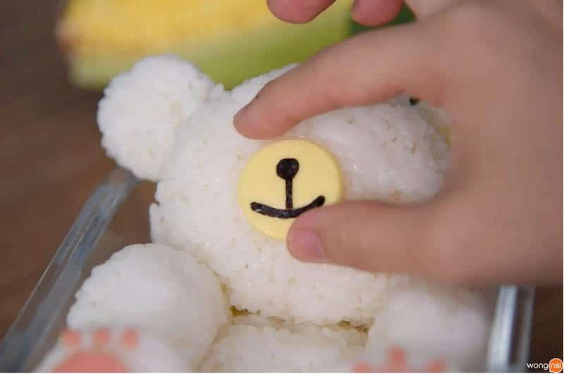 ปั้นหัวหมี นำถ้วยขนาดเล็กมาวางด้วย ฟิล์มยืดถนอมอาหาร M Wrap จากนั้นตักข้าวใส่ลงในถ้วย แล้วใช้มือรวบฟิล์มถนอมอาหาร ปั้นให้เป็นก้อนกลม ๆ แล้วพักไว้ – ปั้นตัวหมี นำถ้วยขนาดเล็กมาวางด้วย ฟิล์มยืดถนอมอาหาร M Wrap จากนั้นตักข้าวใส่ลงในถ้วย แล้วใช้มือรวบฟิล์มถนอมอาหาร ปั้นให้เป็นตัวของหมีแล้วพักไว้ – ปั้นแขนหมี นำถ้วยเล็กทรงสี่เหลี่ยมมาวางด้วย ฟิล์มยืดถนอมอาหาร M Wrap จากนั้นตักข้าวใส่ลงในถ้วย แล้วใช้มือรวบฟิล์มถนอมอาหาร ปั้นให้เป็นขาหมีทั้งสองข้างแล้วพักไว้ – ปั้นขาหมี นำถ้วยเล็กทรงสี่เหลี่ยมมาวางด้วย ฟิล์มยืดถนอมอาหาร M Wrap จากนั้นตักข้าวใส่ลงในถ้วย แล้วใช้มือรวบฟิล์มถนอมอาหาร ปั้นให้เป็นขาหมีทั้งสองข้างแล้วพักไว้ – ปั้นหูหมี นำถ้วยเล็ก ๆ มาวางด้วย ฟิล์มยืดถนอมอาหาร M Wrap จากนั้นตักข้าวใส่ลงในถ้วย แล้วใช้มือรวบฟิล์มยืดถนอมอาหาร ปั้นให้เป็นหูหมีทั้งสองข้างแล้วพักไว้