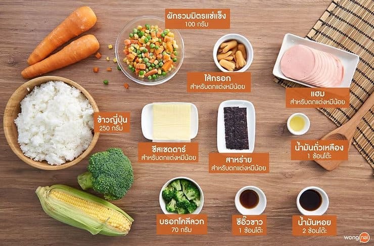 วางแฮมและไส้กรอกลงบนกล่องข้าว จากนั้นนำหัว ตัว แขน ขา และหูหมีมาประกอบรวมกัน จากนั้นตกแต่งตาหมี แก้ม และอุ้งเท้าหมีด้วยแฮม สาหร่ายชีสเชดดาร์ และแครอท – ราดผัดผักที่เตรียมไว้ลงในบนตัวหมี เท่านี้ก็พร้อมเสิร์ฟแล้วล่ะจ้า