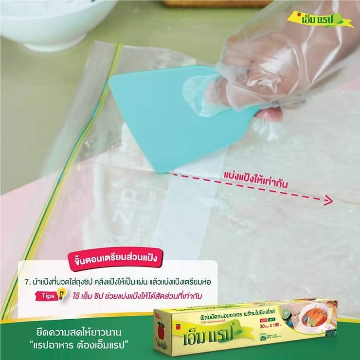 นำแป้งที่นวดใส่ถุงซิป เอ็ม ซิป คลึงแป้งให้เป็นแผ่น แล้วแบ่งแป้งเตรียมห่อ