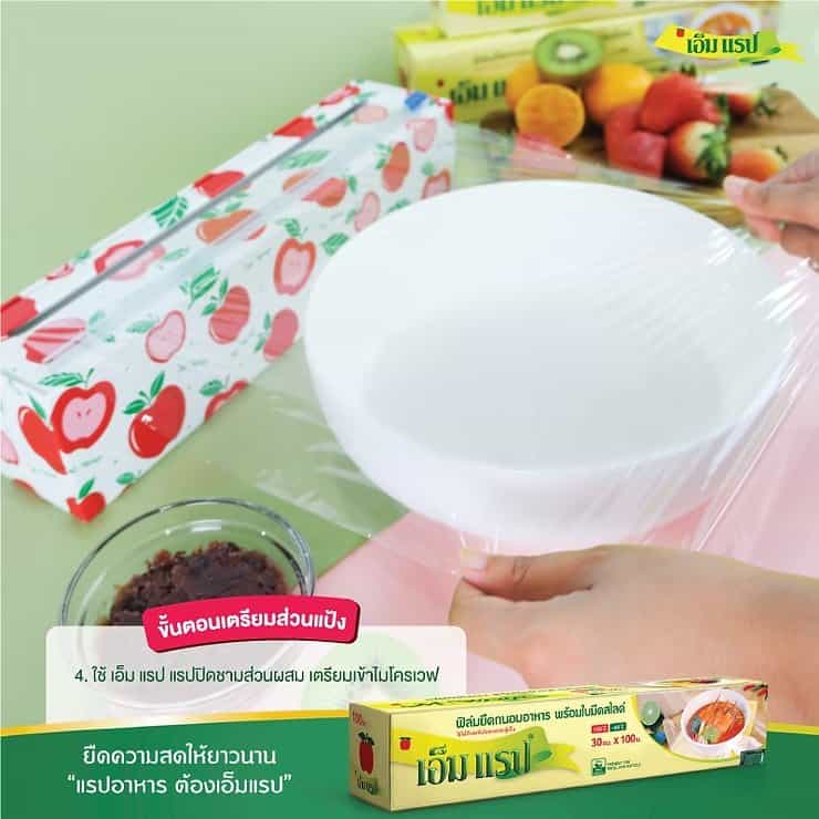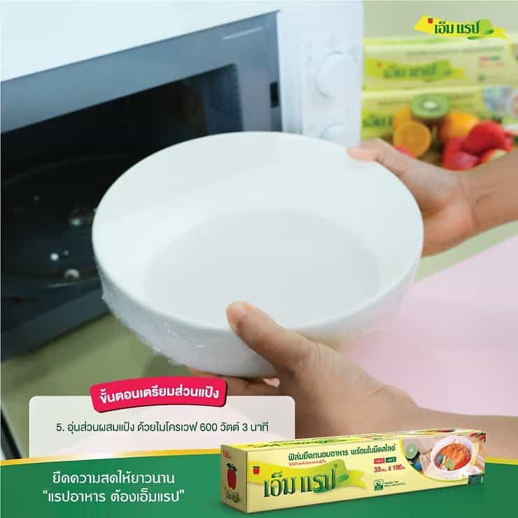 ใช้พลาสติกถนอมอาหาร เอ็ม แรป แรปปิดชามส่วนผสม และเตรียมนำเข้าไมโครเวฟ