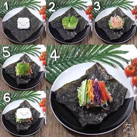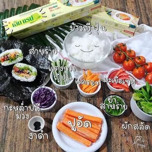 ผักสลัด ปูอัด หรือเนื้อสัตว์ตามชอบ ตามด้วยแตงกวาญี่ปุ่น แครอท กะหล่ำปลีม่วง