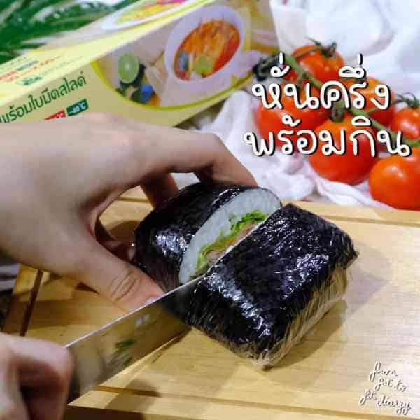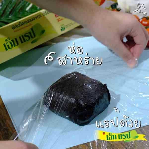 4.พับสาหร่ายเพื่อห่อข้าว และใช้แรปห่ออีกครั้ง จะได้ล็อคให้ตัวซูชิไม่ขยับ และหั่นง่าย
